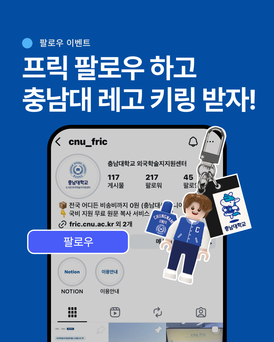 충남대학교 외국학술지지원센터(프릭)의 인스타그램을 팔로우하고 선물도 받아가세요!